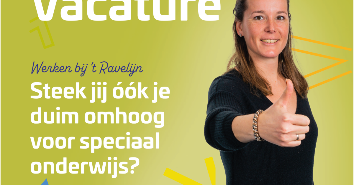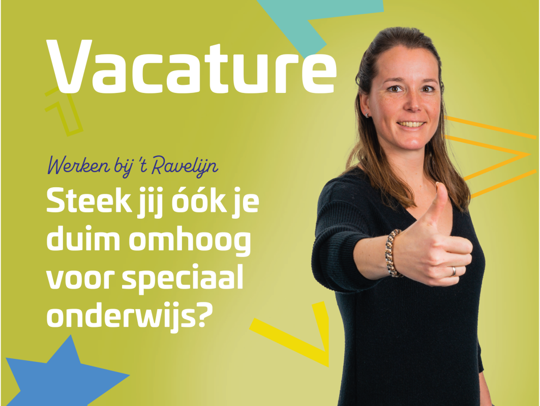 Ben jij op zoek naar een uitdagende baan als leerkracht in het speciaal (basis)onderwijs? Of wil je ontdekken of het speciaal onderwijs bij je past? Wil jij werken in een gezellig en professioneel team? Kortom: steek jij óók je duim omhoog voor het speciaal onderwijs? Dan is Onderwijs Expertise Centrum ‘t Ravelijn in Steenwijk op zoek naar jou!